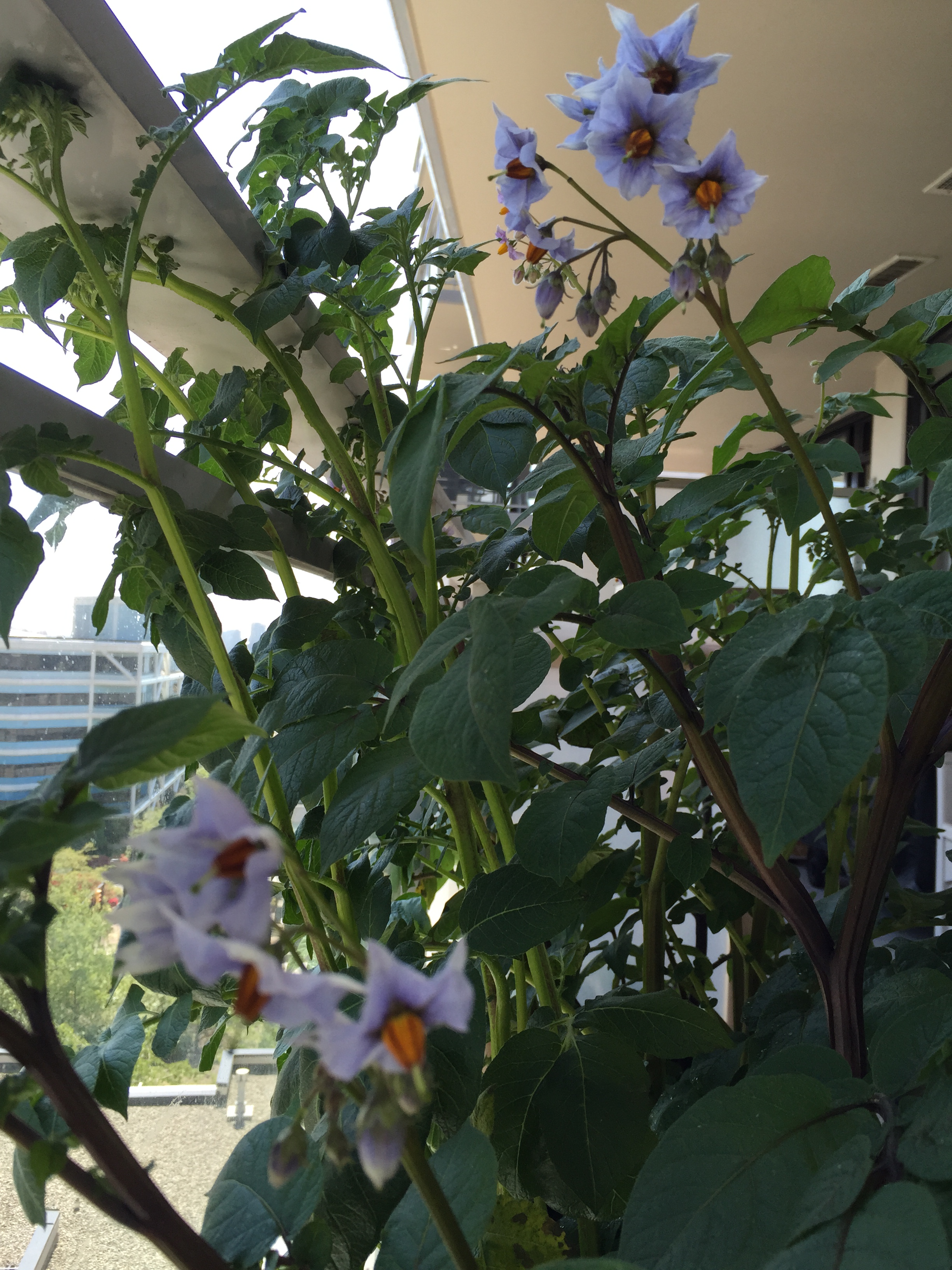 The plants grew very well in the growing bags, and eventually we had tiny purple flowers on top of all three types. We even grew a few potato fruits, which look like tiny green tomatoes! However, beware, because potato fruits are actually poisonous so make sure to pick them and throw them away (especially if you have little kids around who might be tempted to pick them, or mistake them for a tomato).