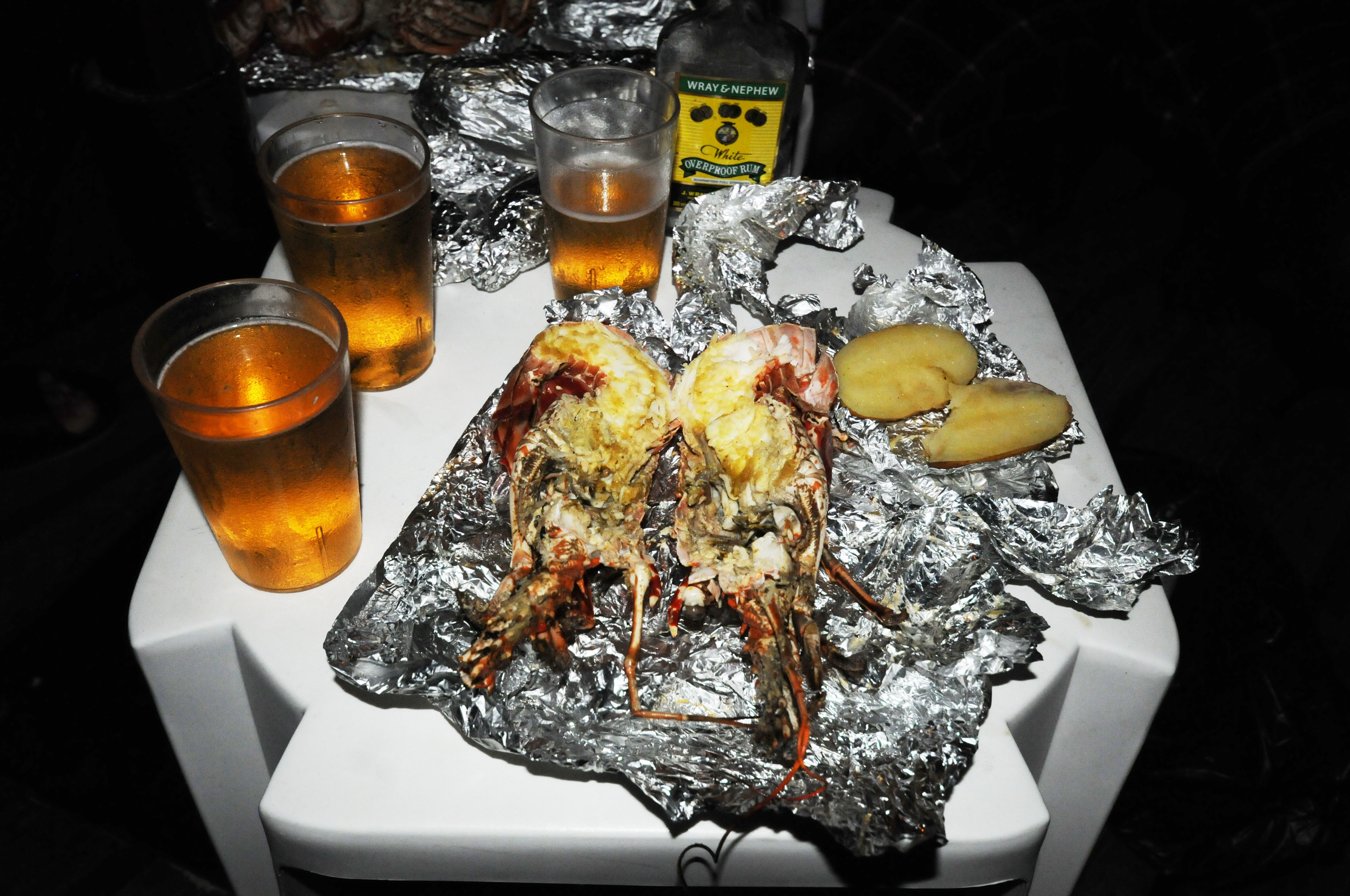 Steamed lobsters, cooked potatoes and Red Stripe beer. Mmm…
