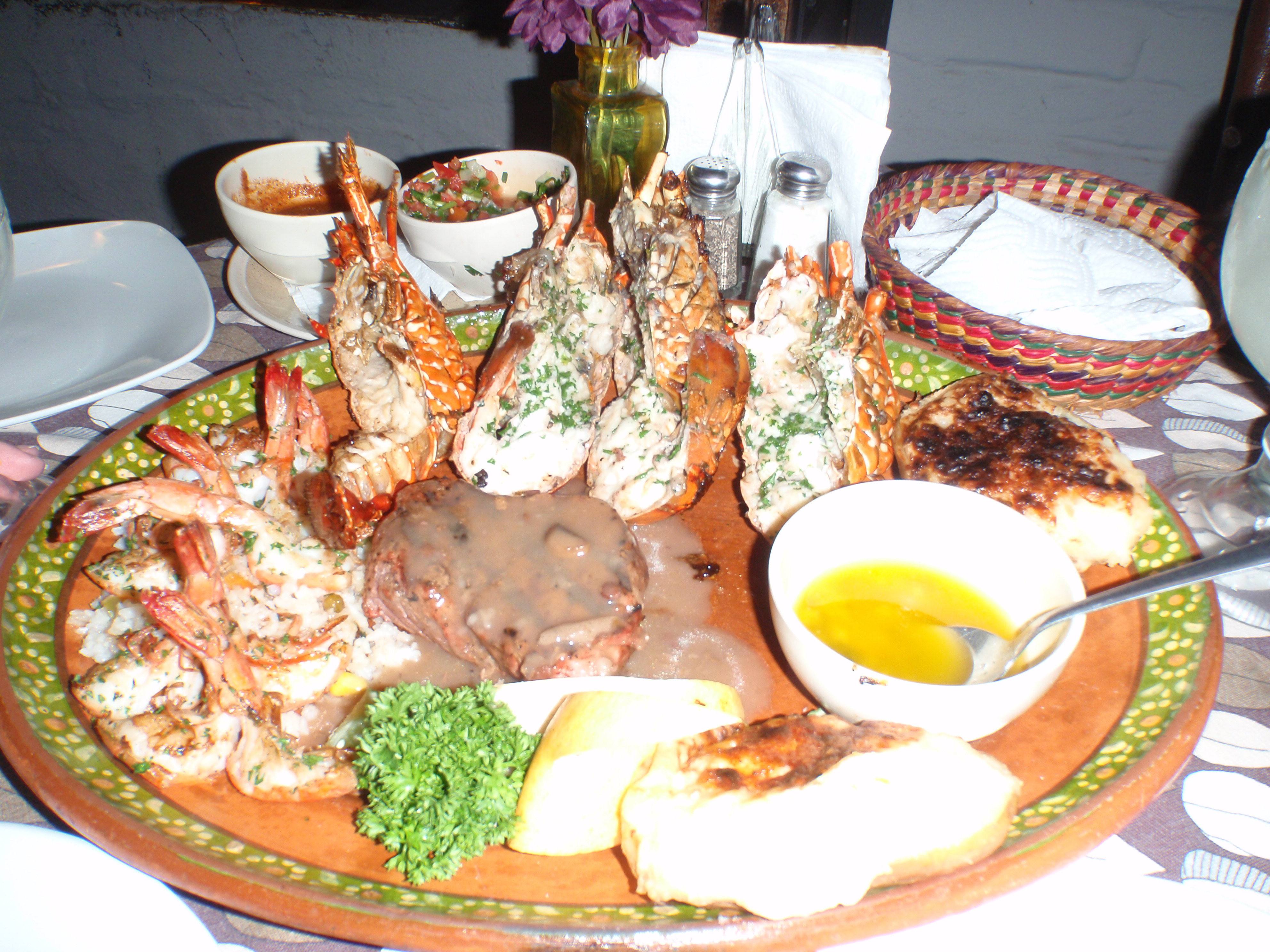 The platter, in all it’s glory, included 2 lobsters, 6 garlic prawns, 2 cheesy baked potatoes, 1 large filet mignon, rice, cooked vegetables and a bowl of heavenly and super garlicky melted butter for dipping.