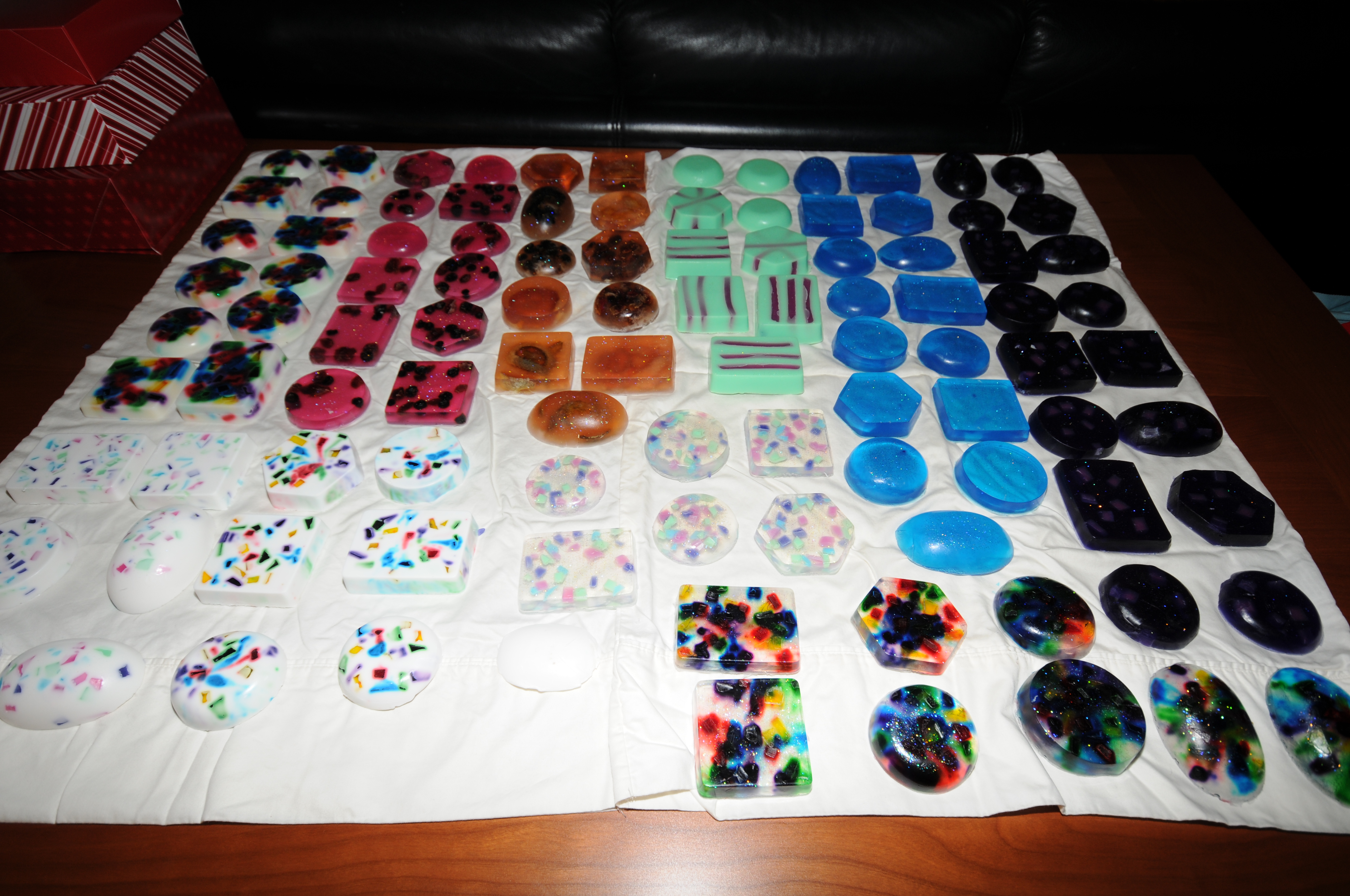 I decided to make home-made gifts for the special people in my life this year and, as usual, my plans were ambitious. I decided months ago that I would make soaps again (they were a huge hit 3 years ago), but I left the actual purchasing of supplies to the second week of December. This wouldn’t have been much of a problem except I also had plans to bake gluten-free strawberry almond sandwich cookies… and chocolate caramels, and chocolate-dipped peanut caramel squares, and peanut brittle. I quickly realized my time was running out and I’d better snap into action. Hence, the holiday workshop was born!