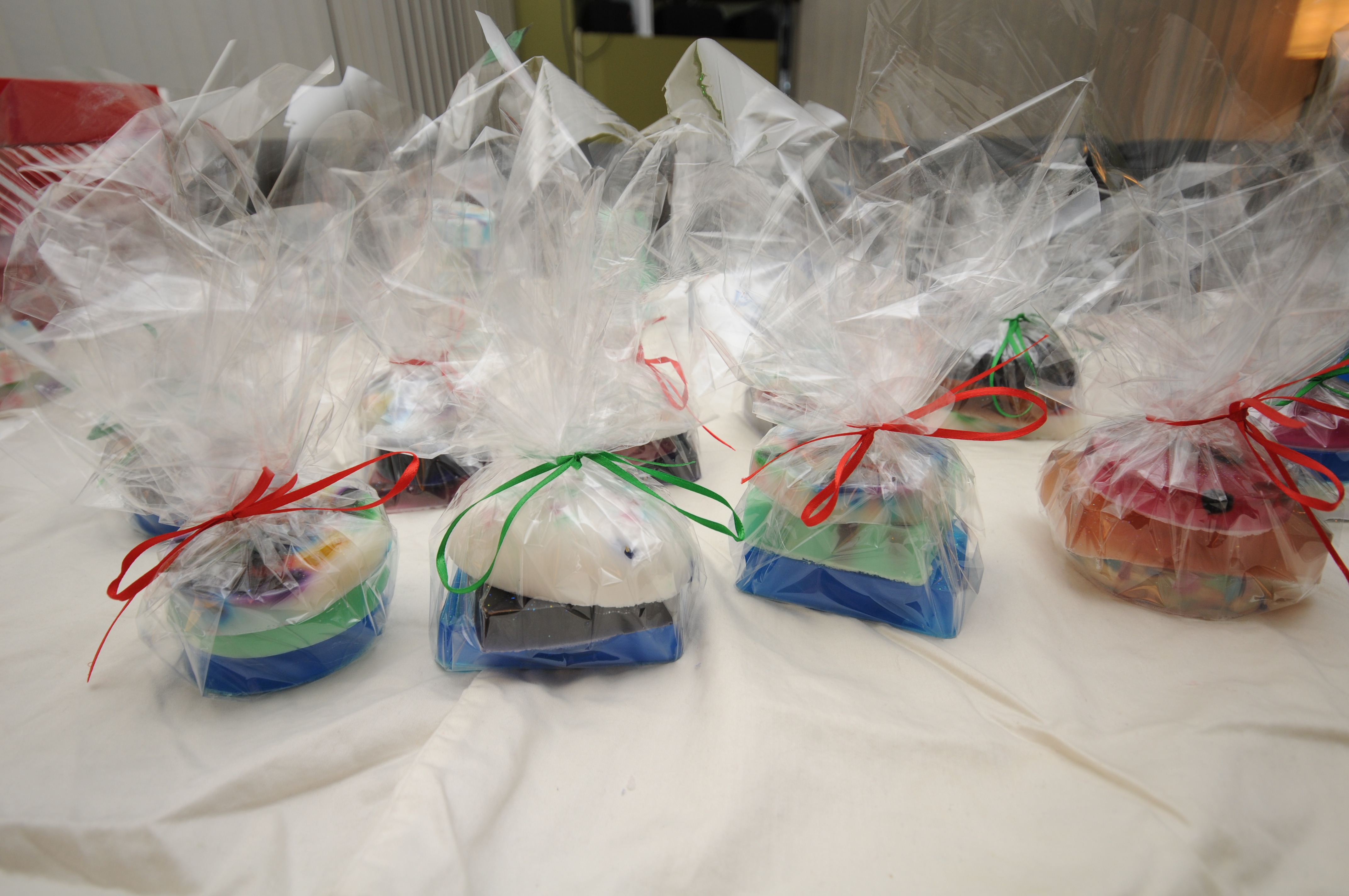 By the end of the two weeks I’d created an impressive tower of home-made goodies: 8 different designs of melt and pour soaps (101 bars total!), plus a tower of individually wrapped chocolate caramels, peanut brittle wrapped in cellophane bundles, and boxed up chocolate-dipped peanut caramel squares and strawberry almond sandwich cookies.