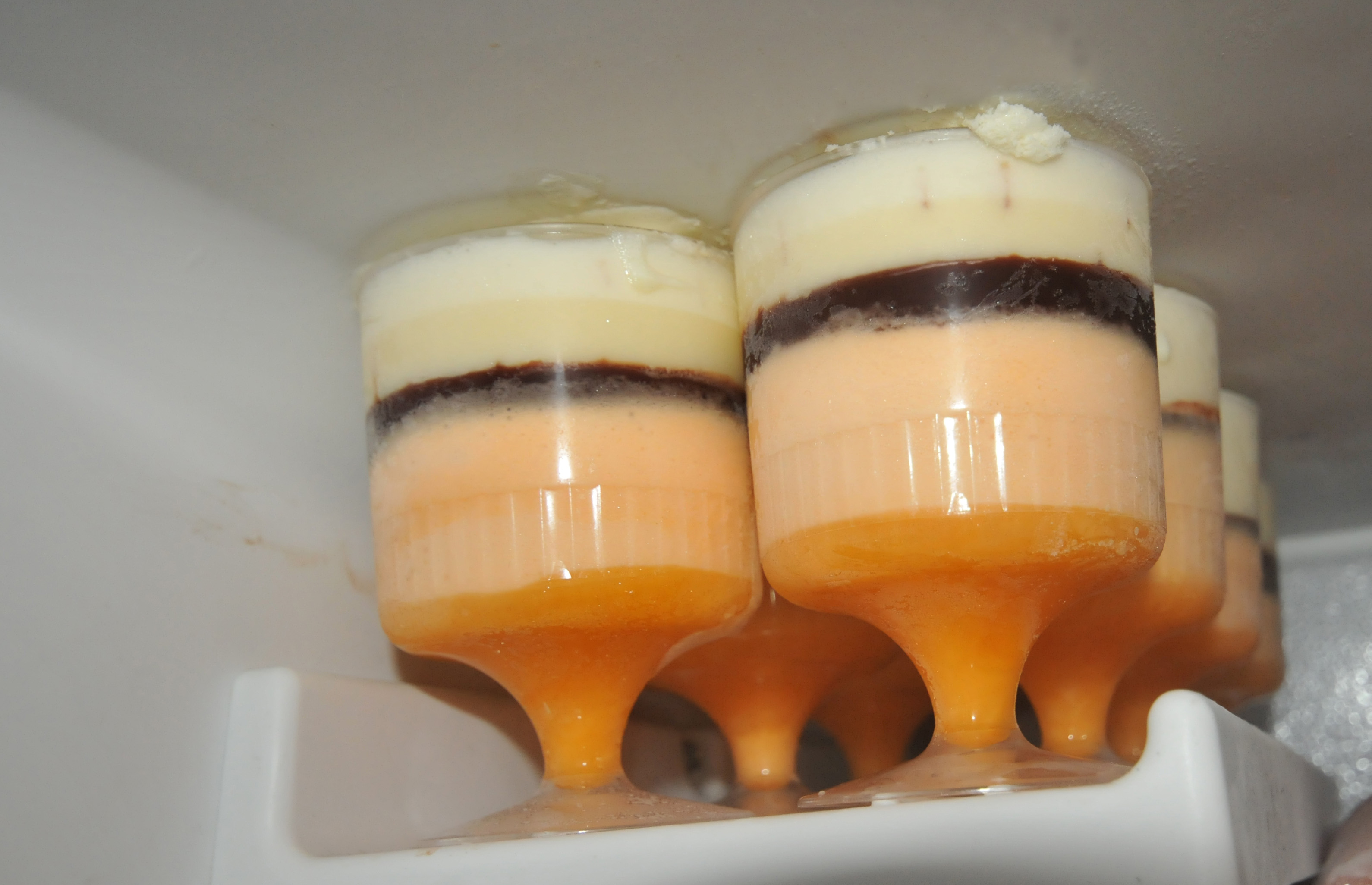 After the chocolate sauce layer had sufficiently frozen, I microwaved a big dish of vanilla ice cream to make it a liquid. I filled up the cups with the remaining vanilla layer and chilled them for a few more hours. The results, at least in the cups where I re-froze the mango again, were nice flat layers of ice cream with a gooey chocolate sauce layer in the middle. If you have the time, I highly recommend making these next Halloween!