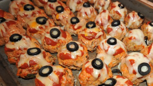 “Spooky Eyes” are a fun meatball appetizer I developed using sliced black olives over melted mozzarella cheese to make them look like ghoulish eyeballs. These meatballs were super easy to make and they looked and tasted great. Here’s my simple recipe if you want to make them yourself.