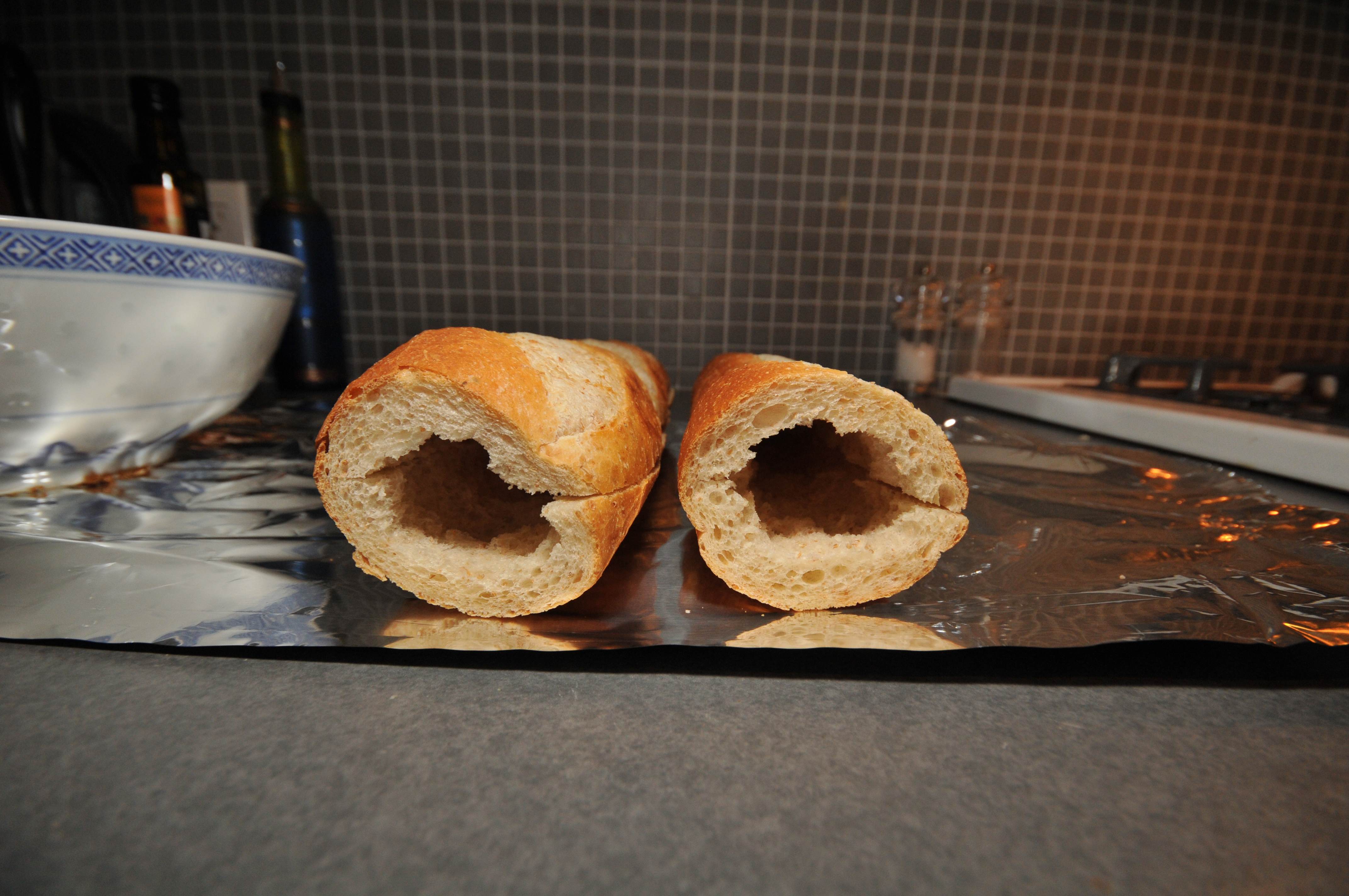 Slice the ends off the baguette and then slice lengthwise, without breaking the bread into two halves. Hollow out the baguette by removing the soft inner bread by hand. Reserve the bread chunks. If you’re using a very long baguette (like I did) you may want to cut it in half to make it easier to manage.