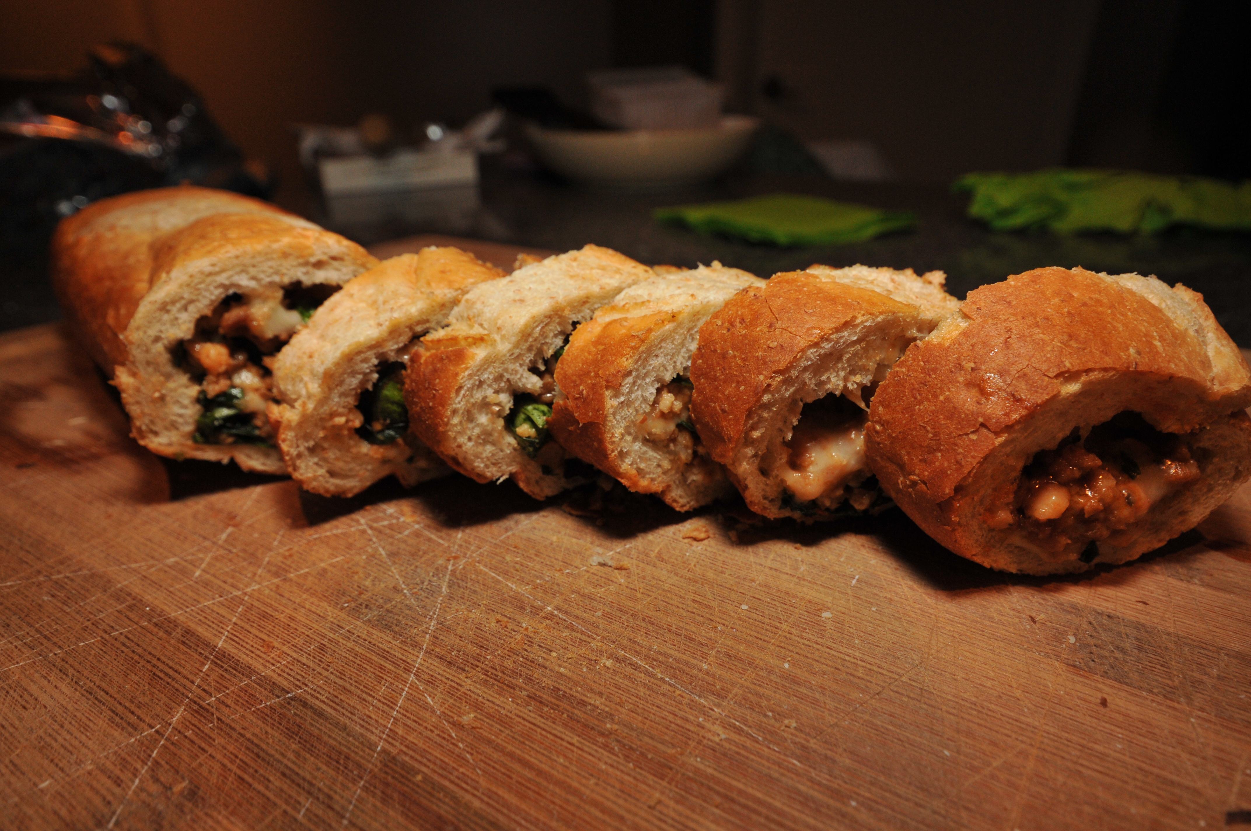Spoon the mixture into the hollowed out baguette carefully, so as not to crack the spine of the bread. Fill the baguette as much as possible. Once the baguettes are stuffed wrap them in tin foil and bake them in the oven for 15-20 minutes at 375°F.